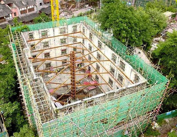 十八梯善果巷35號,剛剛經歷一場精密的“骨科手術”。建筑外墻被鋼架溫柔擁抱,內部卻在進行著脫胎換骨的改造。這不是普通的修繕,而是一次結構體系的徹底革新。