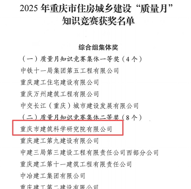 近日,重慶設計集團所屬子企業重慶市建筑科學研究院有限公司(以下簡稱“市建科院”)在參加重慶市住房和城鄉建設工程質量安全總站、重慶市建設工程質量協會組織開展的2025年重慶市住房城鄉建設“質量月”知識競賽中,榮膺3項集體獎、8項個人獎。
