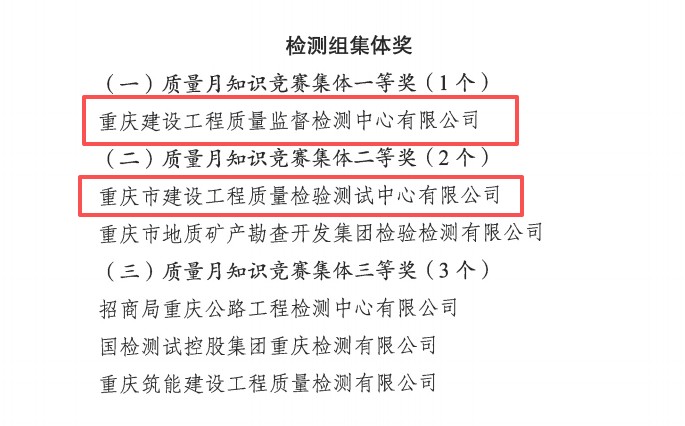 市建科院所屬重慶建設工程質量監督檢測中心有限公司、重慶市建設工程質量檢驗測試中心有限公司在檢測組比賽中表現突出,分別摘得檢測組集體獎一等獎和檢測組集體獎二等獎。